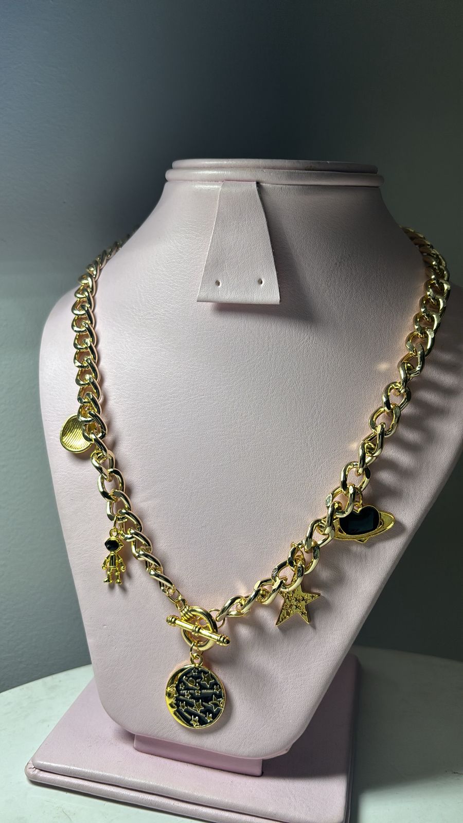 Collar en material rodio; importante cuidar del perfume, cremas y agua.