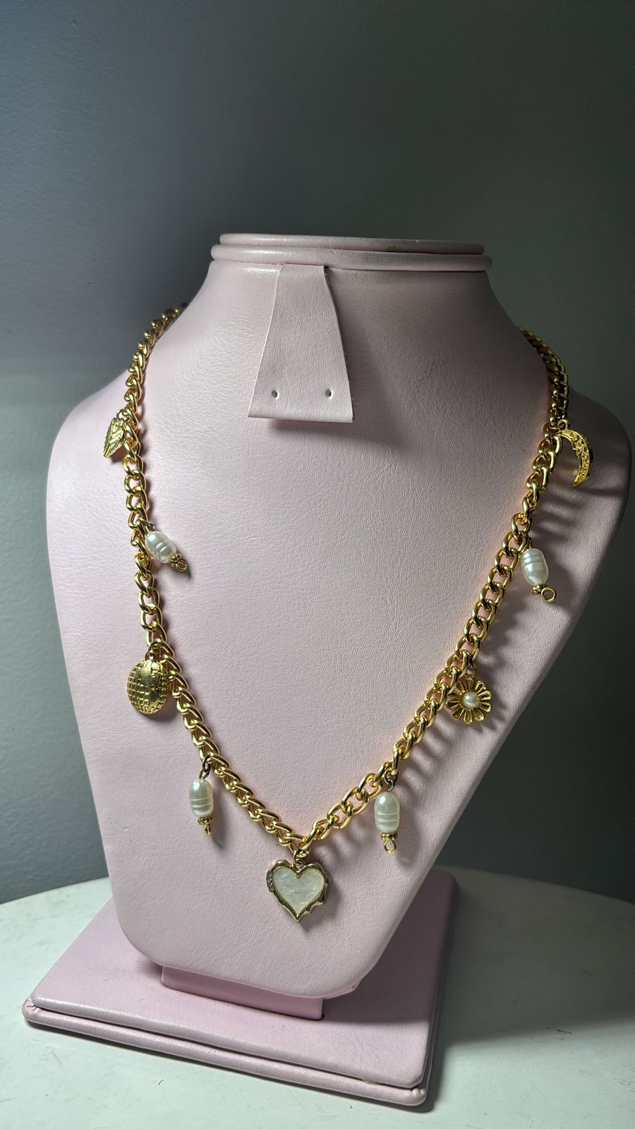Collar en material rodio; importante cuidar del perfume, cremas y agua.
