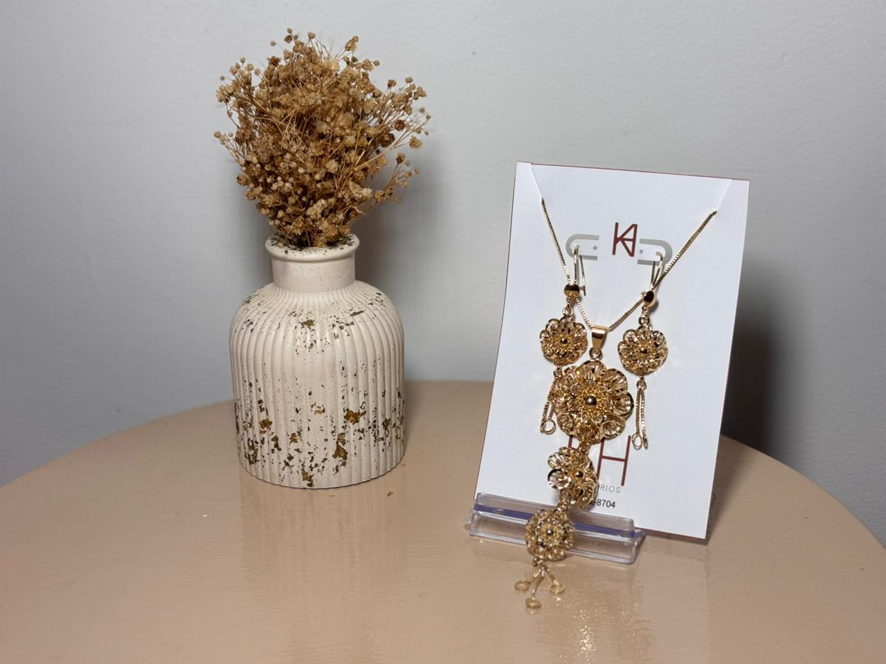 Set de candongas y cadena en material rodio; importante cuidar del perfume, cremas y agua.