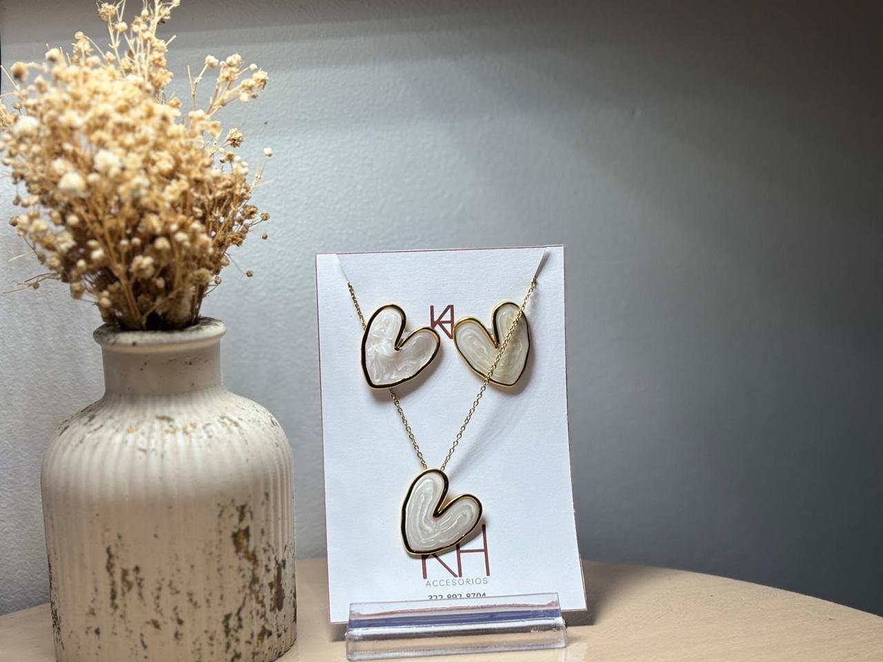 Set de topos y collar en material rodio; importante cuidar del perfume, cremas y agua.